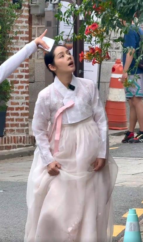 之前有网友在街头偶遇她,她穿着韩服,扎着丸子头,看起来既温柔又清纯。