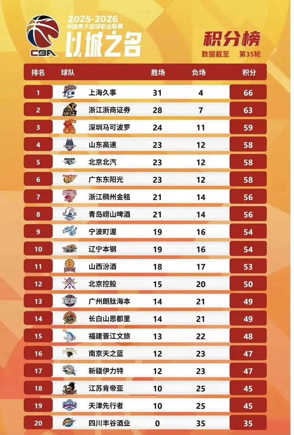 昨晚配资知识网站,随着广州队不敌广厦队、北控队险胜江苏队、山西队惜败青岛队、山东队战胜广东队、北京队大胜南京队、宁波队输给天津队以及深圳队击退新疆队,故此,CBA常规赛第35轮排名出炉。排在积分榜前三的分别是上海队、广厦队和深圳队,排在积分榜4-10名的分别是山东队、北京队、广东队、浙江队、青岛队、宁波队和辽篮,排在积分榜11-20名的分别是山西队、北控队、广州队、吉林队、福建队、南京队、新疆队、江苏队、天津队和四川队。这样一来,7支球队已经提前锁定了季后赛席位,他们分别是上海队、广厦队、深圳队、山东队、北京队、广东队和青岛队。