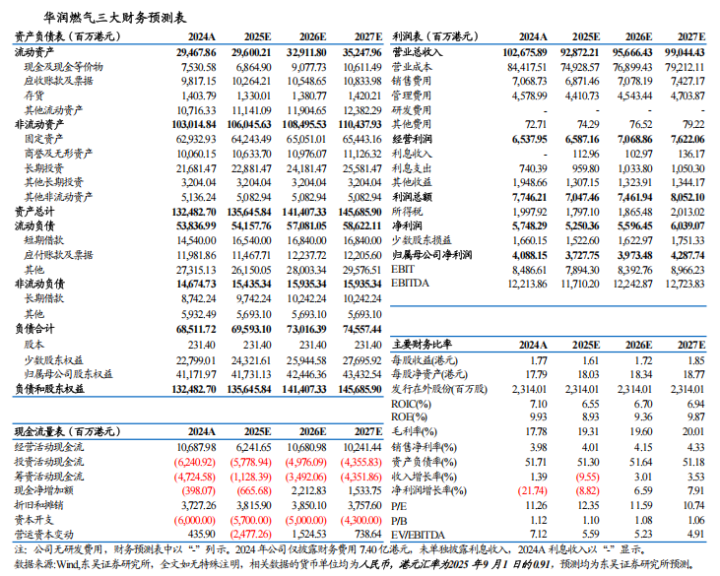 2025H1经营数据不及预期,业绩承压:2025年上半年公司实现归母净利润24.0亿港元,同比-30.5%,不及我们预期;业绩承压系零售气量下滑、综合服务&接驳收入下滑所致。分业务来看:1)零售气:收入同比-3.5%至443亿港元,分类业绩同比-13.6%至40.2亿港元,分部溢利占比72.3%。零售气量207.6亿方,同比-0.69%;其中居民/工业/商业/加气站气量分别为60.0/94.5/48.8/4.3亿方,同比+4.1%/-2.1%/-2.7%/-7.9%。毛差0.55元/方,同比+0.01元/方。公司展望2025年全年零售气量低单位数增长,毛差同比提升0.01元/方。2)接驳业务:收入同比-6.8%至28.1亿港元,分类业绩同比-24.9%至8.44亿港元,分部溢利占比15.2%。新增居民用户83.1万户,同比-19%;旧改用户占比19.7%(同比+5.2pct)。公司展望2025年新增居民接驳210-220万户。3)综合服务业务:收入同比-18.1%至14.5亿港元,分类业绩同比-22.6%至5.9亿港元,分部溢利占比10.6%。受地产周期及消费环境影响,厨电燃热、保险等业务短期承压。公司展望2025年综合服务收入中低单位数增长。4)综合能源业务:收入同比+12.8%至9.33亿港元,毛利额同比+0.6%至1.59亿港元;能源销售量24.7亿千瓦时,同比+8.8%。累计签约装机规模:分布式能源3.3GW、分布式光伏342MW、交通充能582MW。公司展望2025年综合能源收入双位数增长。