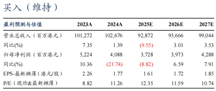 盈利预测与投资评级:考虑到2025H1经营数据不及预期,我们下调2025-2027年公司归母净利润至37.28/39.73/42.88亿港元(原值44.64/49.05/53.76亿港元),同比-8.8%/+6.6%/+7.9%,对应PE12.35/11.59/10.74倍(估值日期2025/9/1);2025年分红金额不下滑对应股息率4.8%,回购股份进一步增加股东回报,维持“买入”评级。