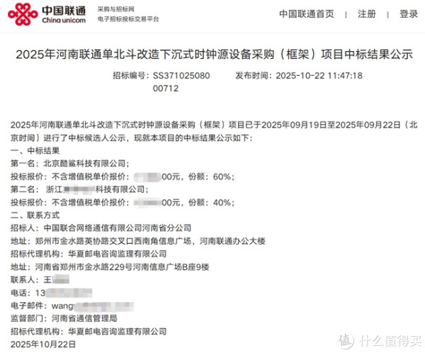2025年深秋,中国联通河南省分公司精密时频设备采购项目揭晓,北京酷鲨科技有限公司以60%份额成为第一中标候选人,超越多家深耕近二十年的行业老牌厂商,引发行业高度关注。此项目专为机房GPS改北斗而设置。